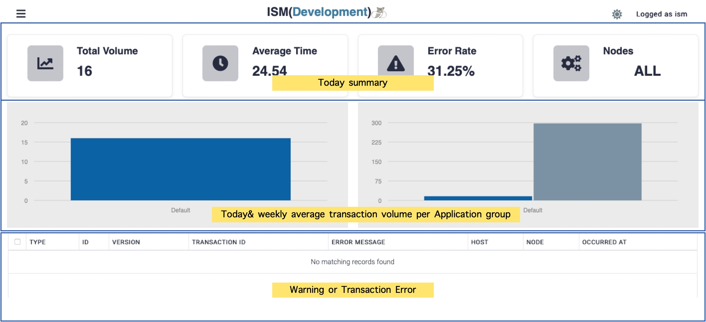 Graphical user interface, application, website Description automatically generatedDashboard consists of three categories.· Today summary shows the summary of today transactions and the status of instances.· Today & weekly average shows the volume of today and weekly average volume per application group.· Warning & Error shows the warning alert or transaction errors.· Transaction errors displays for 10 minutes and warnings are displayed when any threshold is defined and monitoring value is over that threshold.This summary information is refreshed every 30 seconds.
