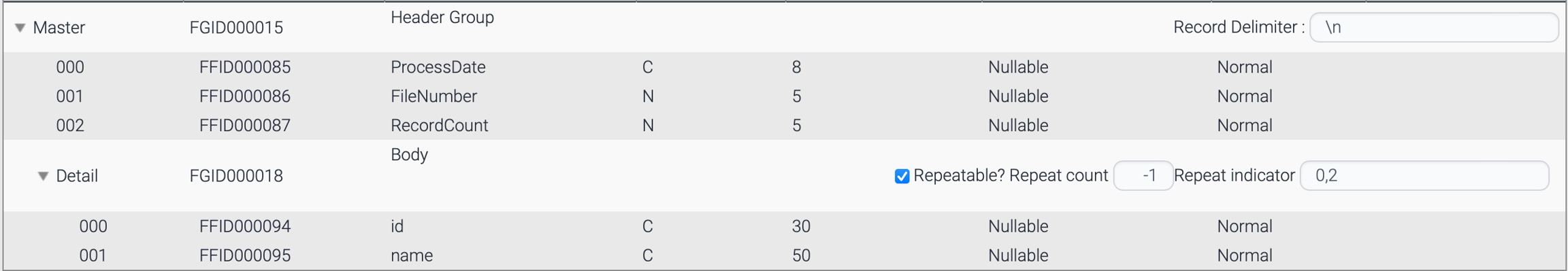 This data has a record delimiter, and this record delimiter is used to separate master records and detail records in the master. If a record delimiter is set, then the same delimiter is used to separate the detail records.