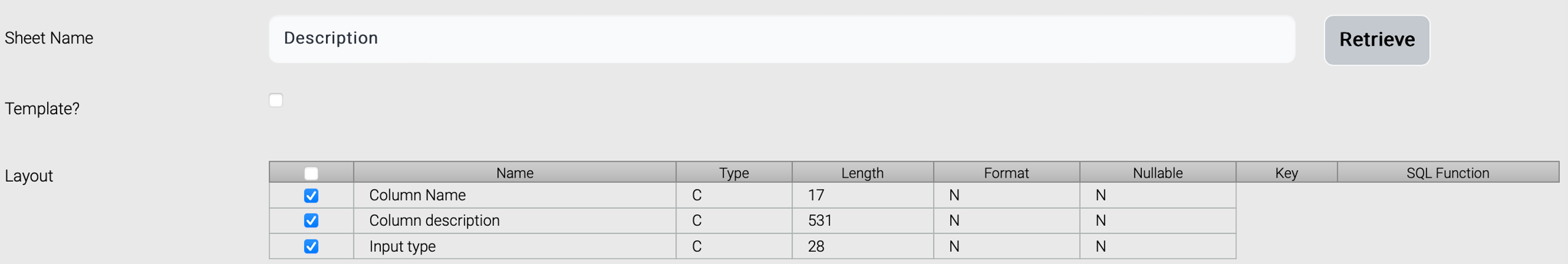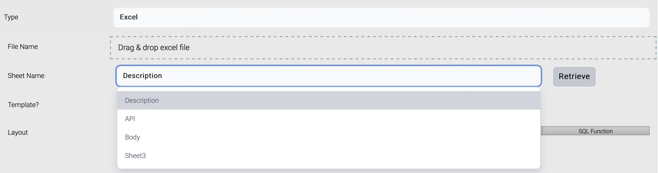 Drag and drop excel file and sheets are listed. Choose the target sheet, check/uncheck Template, and click Retrieve.