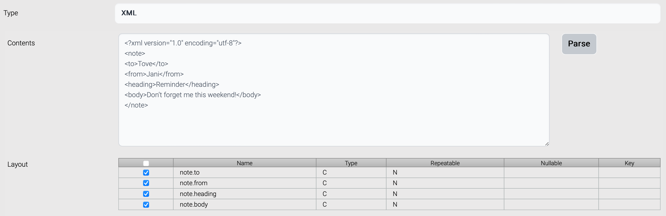 This type of data structure is generated from a sample xml. Enter a sample xml, click Parse button, and the parsed result is displayed at the bottom.