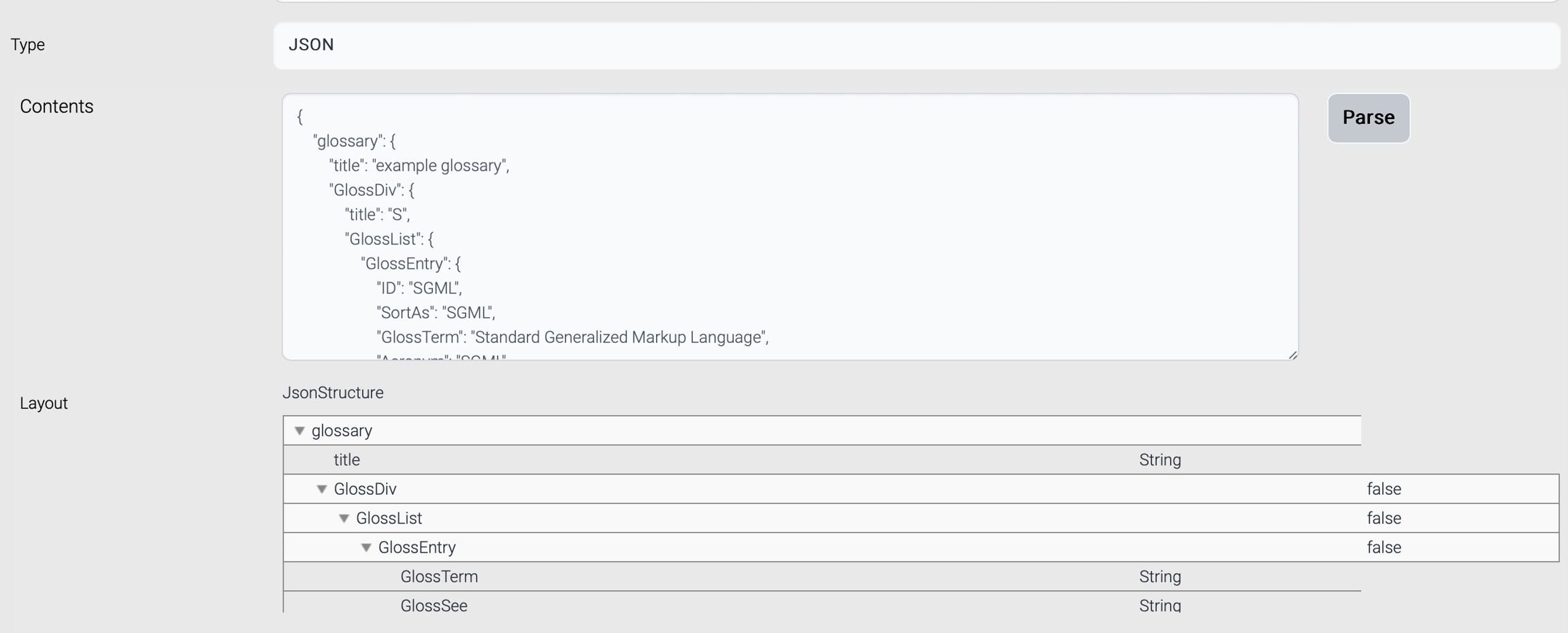 This type of data structure is generated from a sample json. Enter a sample json, click Parse button, and the parsed result is displayed at the bottom.