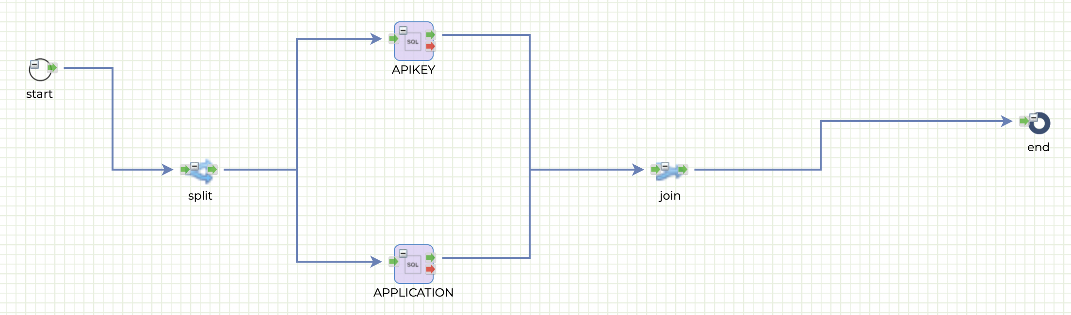This flow is split into two SQL components and joined after those SQL components. Split creates two threads and assigns the SQL components to each thread respectively. Those two SQL queries are executed concurrently and Split waits until all the threads are complete. Once all the threads are complete, Split is complete..