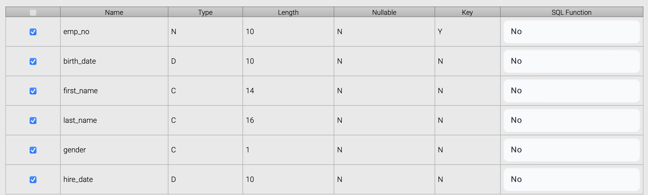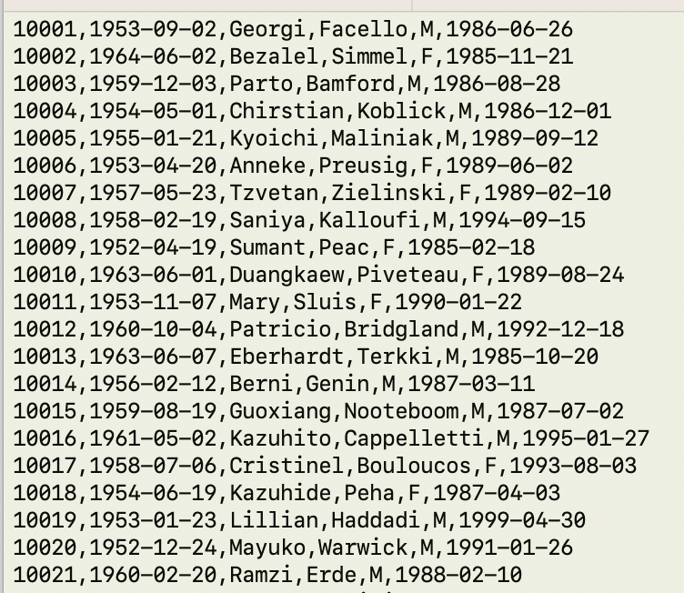 In this scenario, a source file containing data needs to be synchronized with a target database table. The source file has six columns: id, birth date, first name, last name, gender, hire date, and the target table has the same columns.