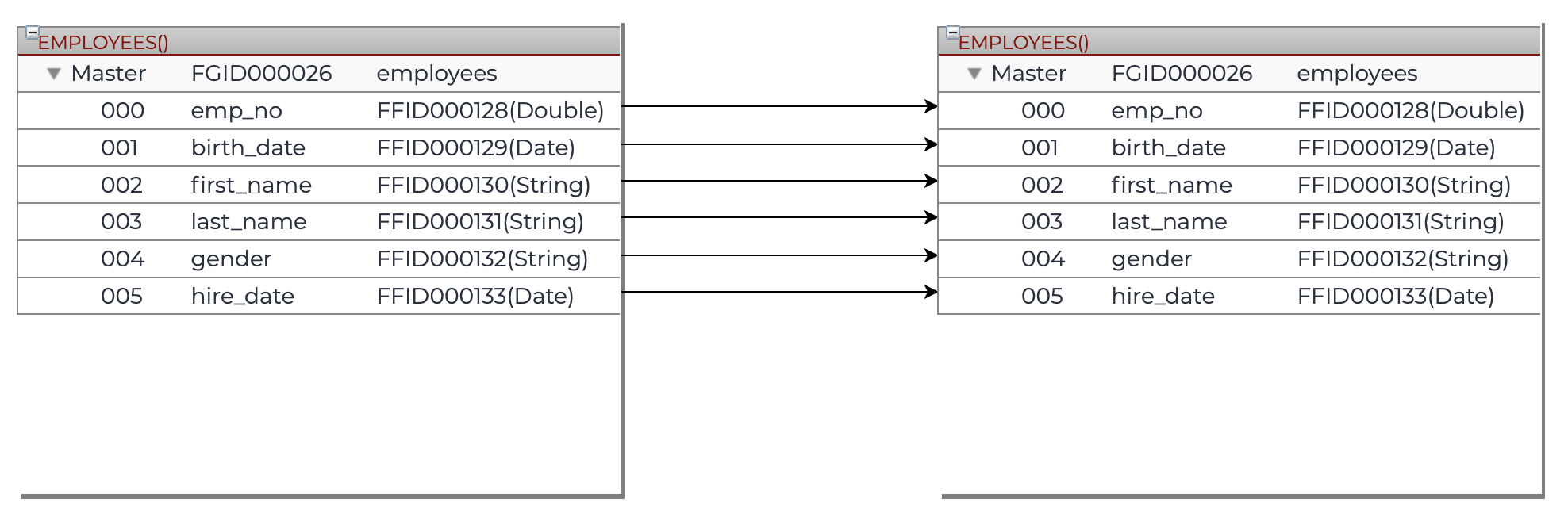In this case, the Mapping component is simply mapping the source columns to the corresponding destination columns based on their names. This is useful when the source and destination have similar column names and you want to simply copy the data from one to the other without any transformations or calculations.