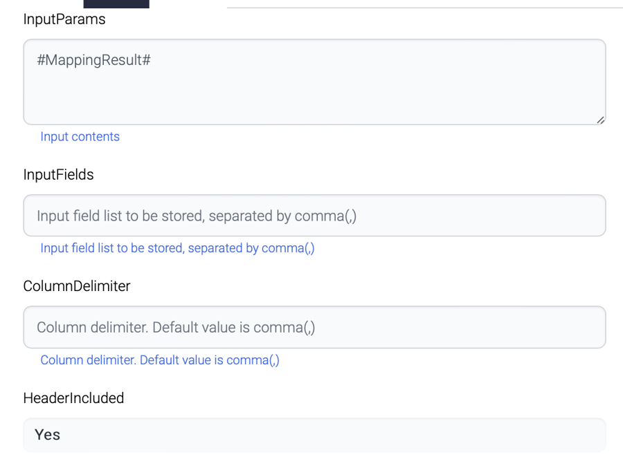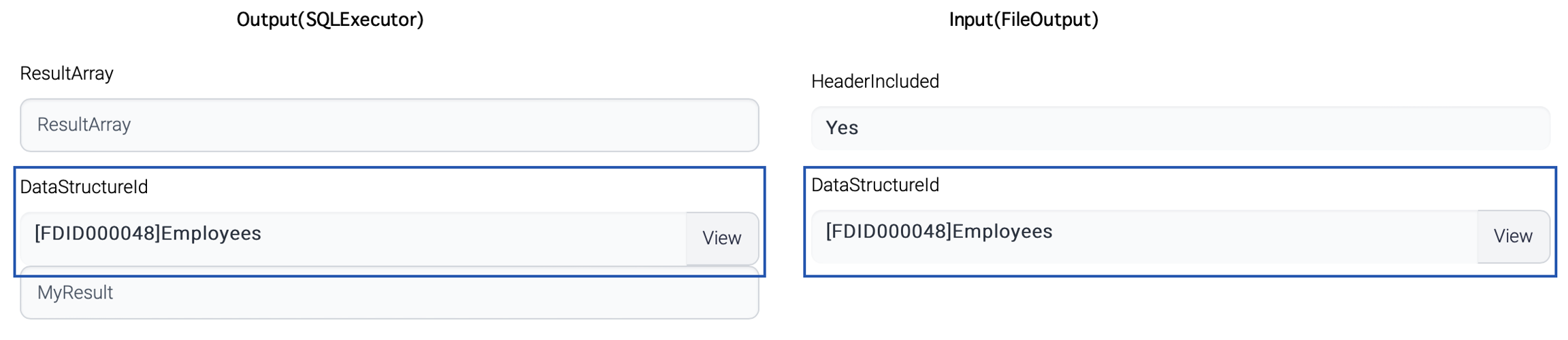 The FileOutput task uses the data from the MappingResult parameter to generate the output file this time. The output file configuration is the same as the previous example.