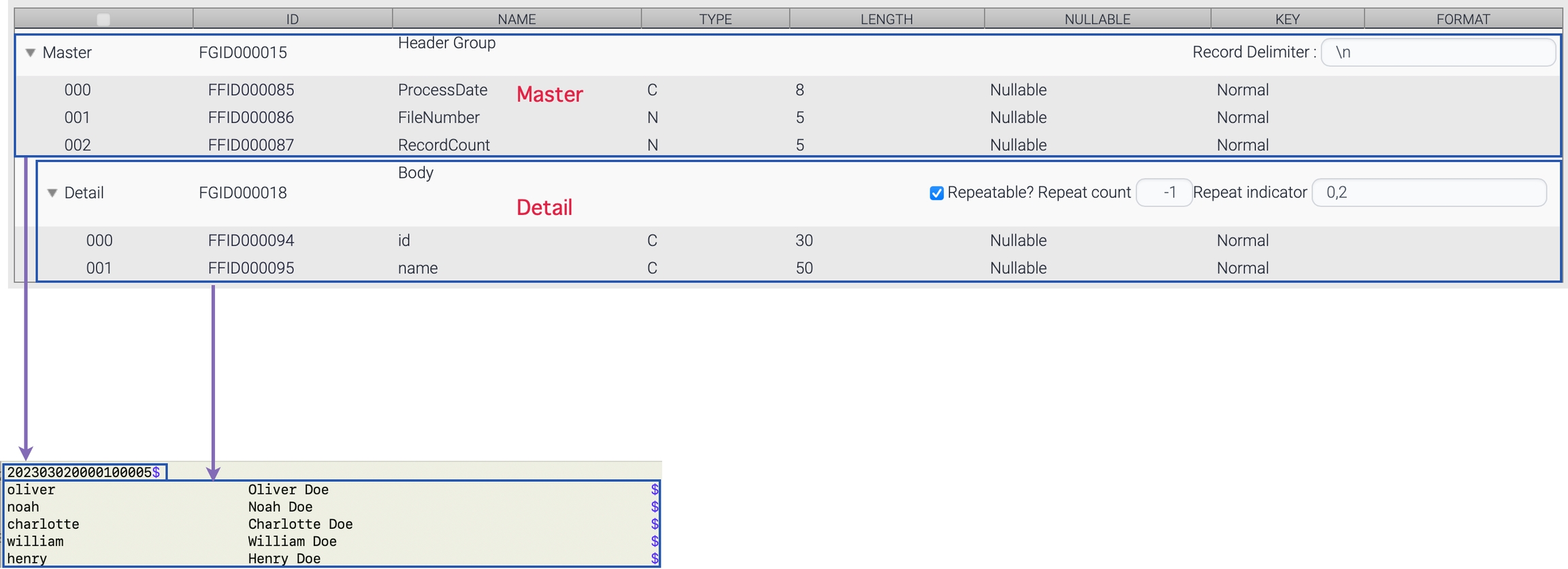 This data structure consists of one master group and one detail group. The detail group is repeatable, and the repeat count is set at the third field named RecordCount.